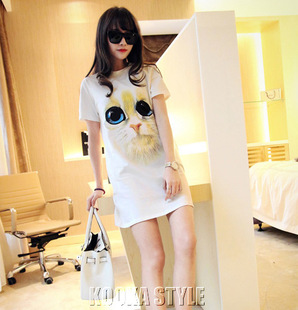 2015歐洲站夏裝新款純棉圓領中長款T恤衫 貓頭印花短袖打底衫 /