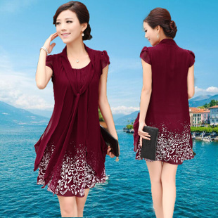 中老年夏季雪紡短袖假兩件連衣裙媽媽裝中長款女韓版大碼胖mm顯瘦 /