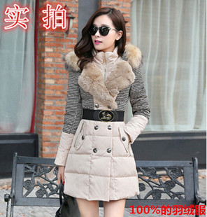 實拍2014冬裝新款千鳥格拼接奢華貉子毛領(lǐng)羽絨服中長款修身加厚 /