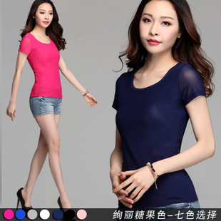 2015夏裝新款韓版修身顯瘦女裝大碼短袖T恤女純色網(wǎng)紗女打底衫 /
