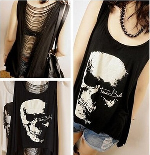 速賣通2015新款寬松個性不規(guī)則打底衫性感鏤空露背骷髏頭背心女t /