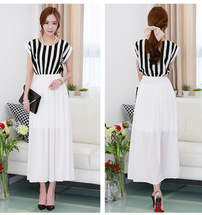 2015夏裝圓領(lǐng)顯瘦格子拼接修身雪紡波西米亞長款連衣裙 /