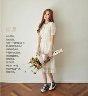 夏季新款中長(zhǎng)蕾絲白色長(zhǎng)裙沙灘裙顯瘦短袖韓版大碼連衣裙 /