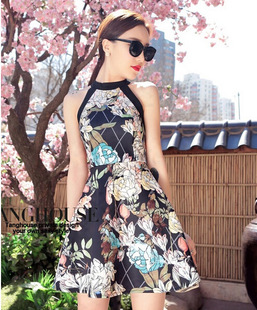2015掛脖露肩印花高腰修身顯瘦背心連衣裙 誠(chéng)招代理 一件代發(fā) /