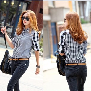 2015秋裝新款韓版不對稱格子長袖襯衫長袖格子襯衫 速賣通爆款 /