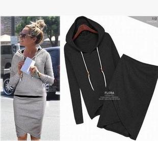 長袖連帽包臀上衣+不規(guī)則半身裙休閑兩件衛(wèi)衣女套裝工廠直銷 /