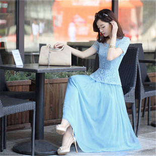 2015夏季新款顯瘦透氣短袖蕾絲長(zhǎng)裙 短袖女藍(lán)粉色連衣裙 /