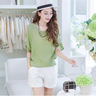 新款韓版大碼露肩短袖棉麻上衣配白色短褲兩件套休閑套裝女 /