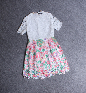 火爆熱銷連衣裙 歐美高端華倫水溶印花裙圓領(lǐng)短連衣裙 批發(fā) /
