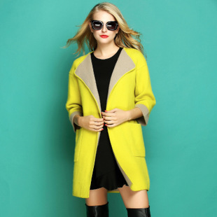 2015冬裝新款翻領(lǐng)撞色女式口袋大衣 100%貂絨加厚保暖女裝批發(fā) /