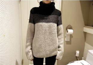 2015新款韓國(guó)毛衣女 韓版加厚套頭高領(lǐng)粗針漸變色條紋針織衫女裝 /