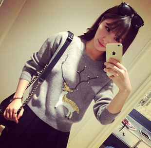 2015春季新款毛衣女小鹿釘珠亮片刺繡圓領(lǐng)寬松套頭針織衫打底衫女 /