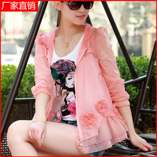 2015新款連帽雙層蕾絲防曬衣長袖薄款防曬衫防紫外線防曬服 女 /