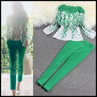 2014春裝款歐美女裝 菁菁同款蕾絲拼接印花雪紡衫+鉛筆褲 套裝 /