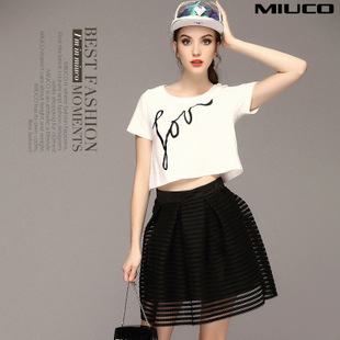 2015夏款女裝新款時尚字母短款T恤+竹節(jié)織花蓬蓬半身裙套潮 /
