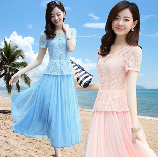 2014夏季新款女裝顯瘦透氣短袖蕾絲長裙短袖連衣裙女藍粉色連衣裙 /