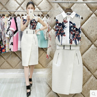 2015夏新款韓版三件套印花雪紡衫修身棉麻半身裙歐根紗時尚套裝女 /