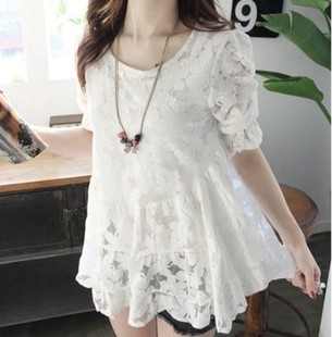 新款夏韓國代購蕾絲衫女款休閑中長款上衣鏤空大花雙層雪紡 /