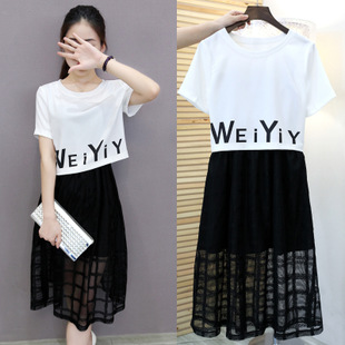 歐洲站2015夏新款女裝格子網(wǎng)紗A字裙中長(zhǎng)款兩件套裙連衣裙字母 /