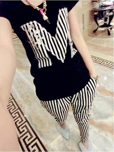 (好質(zhì)量)新黑白條紋M字母鑲鉆短袖T恤條紋小腳褲兩件套休閑 /