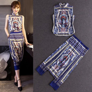 2015夏季新款歐美大牌女裝時(shí)尚印花無(wú)袖上衣+五分褲裙褲兩件套 /