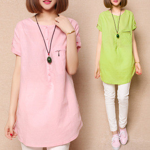 新款韓版小清新圓領(lǐng)寬松顯瘦棉麻短袖襯衫女亞麻 /