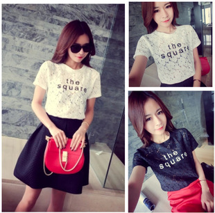 2015 春夏裝韓國(guó)新款時(shí)尚潮流百搭勾花鏤空蕾絲T恤女 /