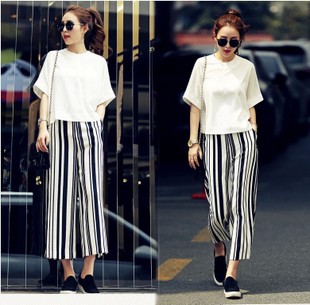 夏裝新款短袖棉T恤+條紋九分闊腿褲套裝時尚個性休閑女裝批發(fā) /