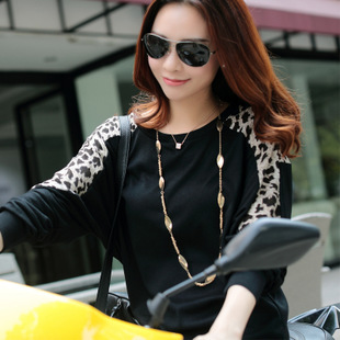長袖T恤秋款打底衫蝙蝠袖豹紋拼接寬松大碼女裝 /