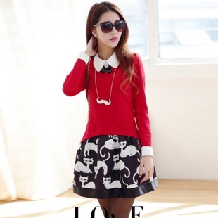 2014秋裝新品娃娃領(lǐng)貓咪假兩件套連衣裙YYF9665 /