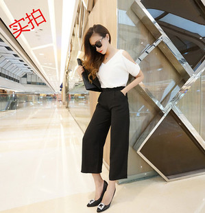 實拍.新款闊腿褲兩件套潮棉麻襯衫夏裝T恤韓版氣質(zhì)露肩短袖 /