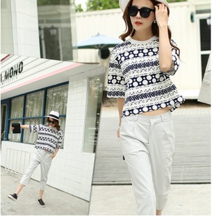 實拍2015春夏新款時尚套裝女 短上衣半袖襯衫休閑褲子 /