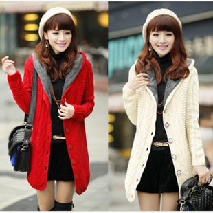 韓國毛衣 2015秋冬新款女裝 外套 中長款連帽加絨針織衫毛衣 /