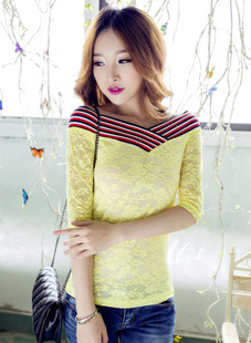 2015夏季新款韓版V領(lǐng)修身顯瘦短袖露肩性感蕾絲衫好質(zhì)量 /