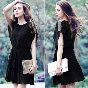 • 歐洲站2015夏季新款歐美大碼純色立體修身百褶雪紡連衣裙 /