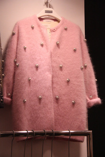 韓國東大門代購甜美女手工釘珠鑲鉆珍珠兔毛中長款毛衣女外套 /