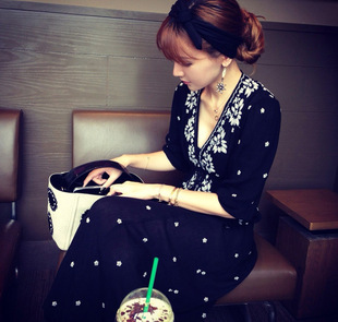 2015新款女裝名媛嗆口小辣椒 刺繡花工藝V領(lǐng)黑色連衣裙長裙女 /