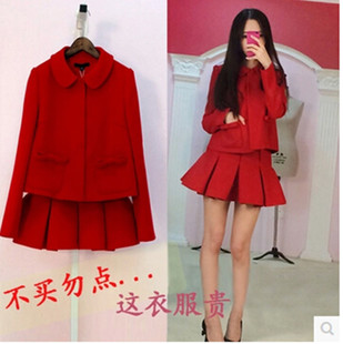 歐洲站娃娃領(lǐng)羊毛呢套裝裙兩件套冬 蝴蝶結(jié)紅色毛呢大衣套裝女裝 /