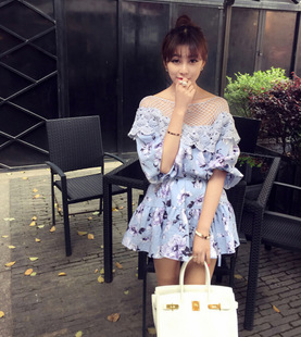 2015夏裝韓版女裝 時尚花朵蕾絲網(wǎng)紗拼接印花燈籠袖連衣裙 /