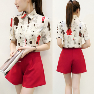 2015夏季新款女裝通勤氣質(zhì)性感花襯衫紅色闊腿短褲時尚休閑套裝 /