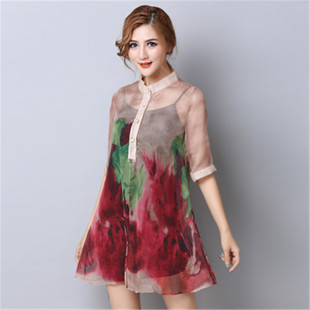 • 2015夏季新品歐美高檔印花桑蠶絲連衣裙 寬松五分袖真絲兩件套女 /
