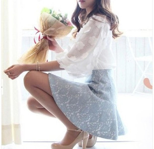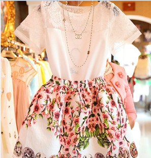 韓國代購套裝2015夏季新款韓版蕾絲刺繡雪紡衫蓬蓬連衣裙套裝女 /
