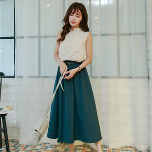 歐洲站2015女裝新款套裝夏季歐美無袖襯衣+百皺長(zhǎng)裙休閑套裝女 /