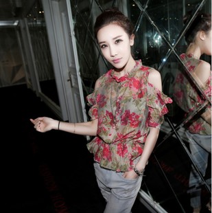 2015歐洲站夏裝新款時(shí)尚露肩印花女t恤短袖收腰打底衫女 /