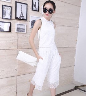 歐洲站2015夏新款名媛氣質(zhì)七分闊腿褲兩件套 蕾絲時(shí)尚套裝 /