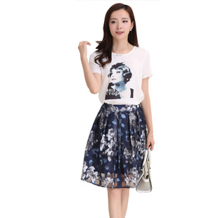 夏新款連衣裙印花棉麻短袖T上衣兩件套裝裙子歐根紗中長款潮 /
