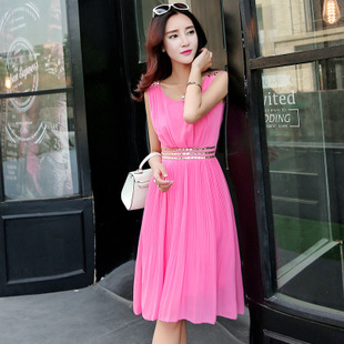 2015夏裝新款韓版時尚名媛高腰釘珠雪紡無袖長款百褶連衣裙 /