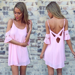 歐美外貿(mào)爆款新款粉色喇叭袖性感吊帶露背雪紡短袖連衣裙速賣通 /