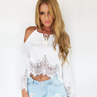 速賣通爆款歐美女裝2015年性感的蕾絲雪紡上衣白色 /