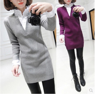 • 冬裝新款韓版花邊襯衫領假兩件修身顯瘦長袖針織連衣裙女針織衫 /